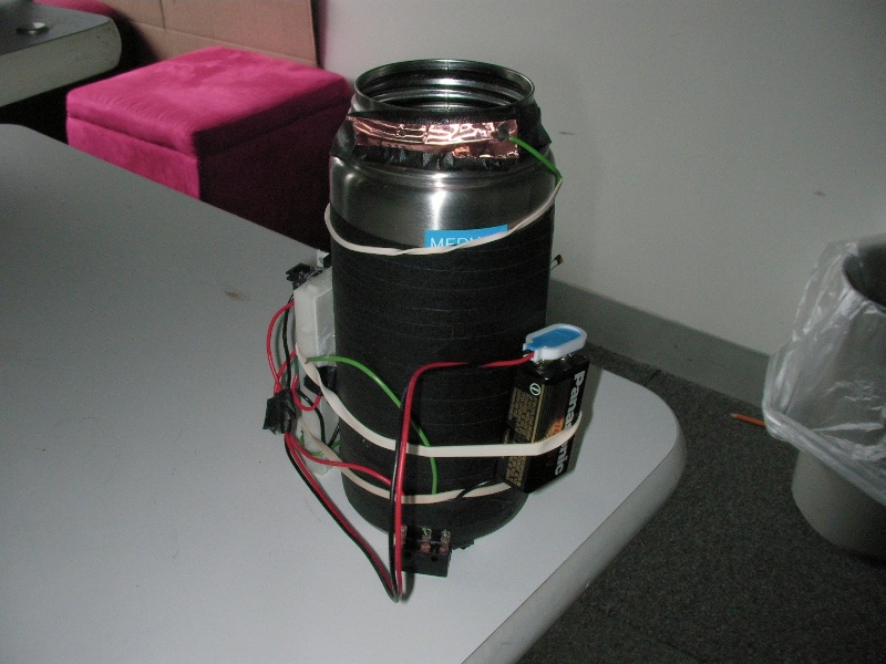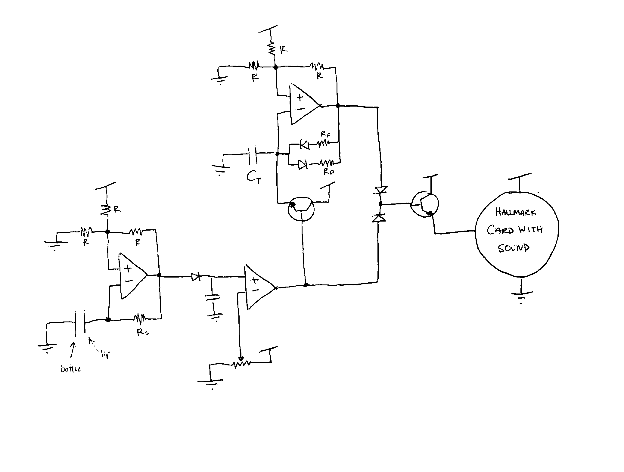 The capacitive sensor is also powered by a hysteretic oscillator. There is a strip of copper tape around the mouth of the metal bottle, forming the capacitor. When the user lifts the bottle and touches the tape with his lip, the capacitance changes, decreasing the frequency of oscillation. This change can be detected, and that causes the music to play and resets the timer.