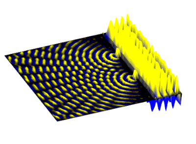 Mark Cavolowsky, Jeff Dezso and I programmed this wave simulator as a final project for a class called Engineering of Distributed Systems. Since light is wave, we decided to program various different light experiments, including a parabolic mirror, a prism, and the double slit experiment above.